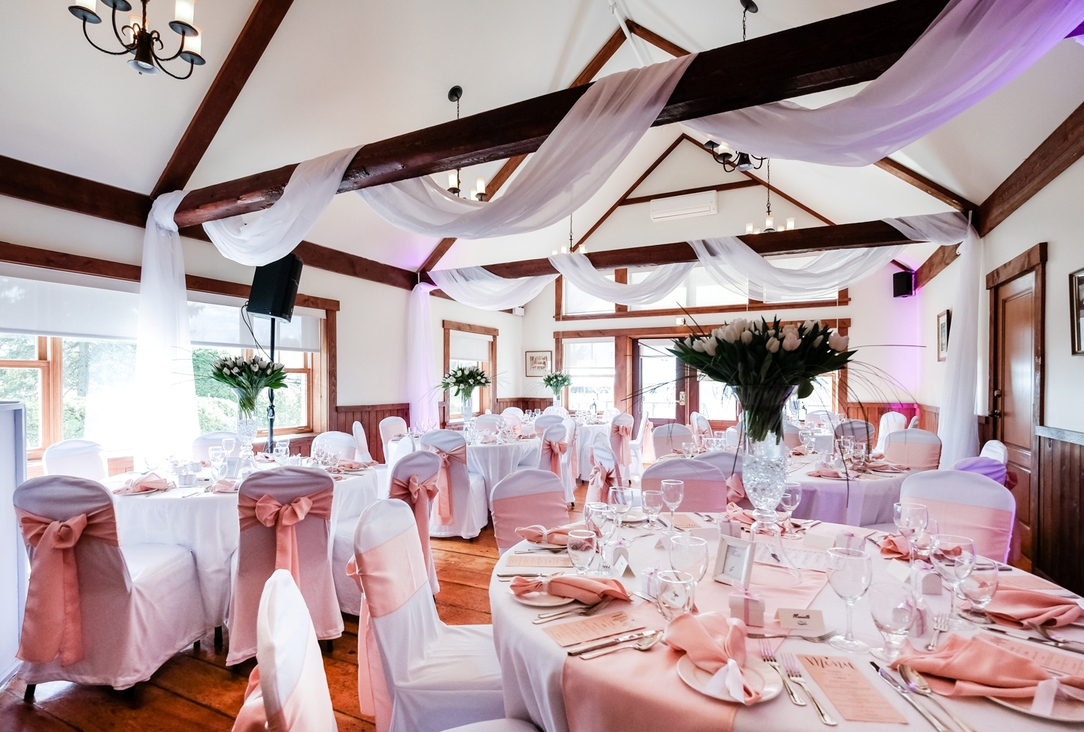 Traditional style hall with cathedral ceiling, situated in the main buildind, fenestration on two sides with view of the gardens.