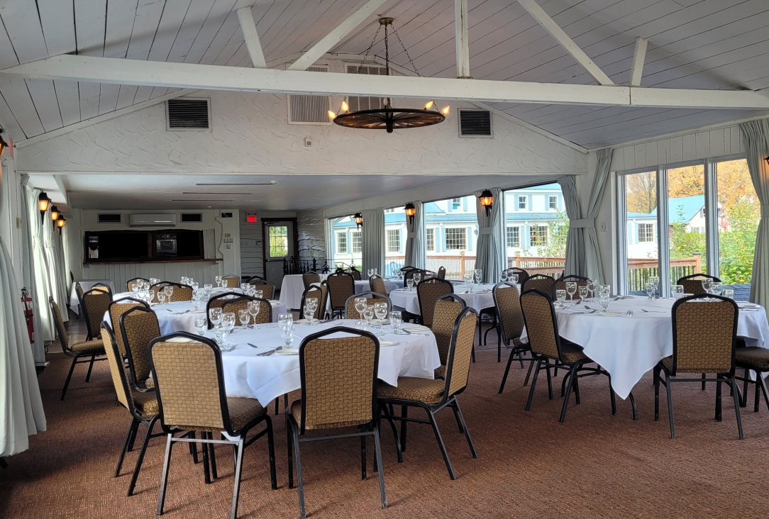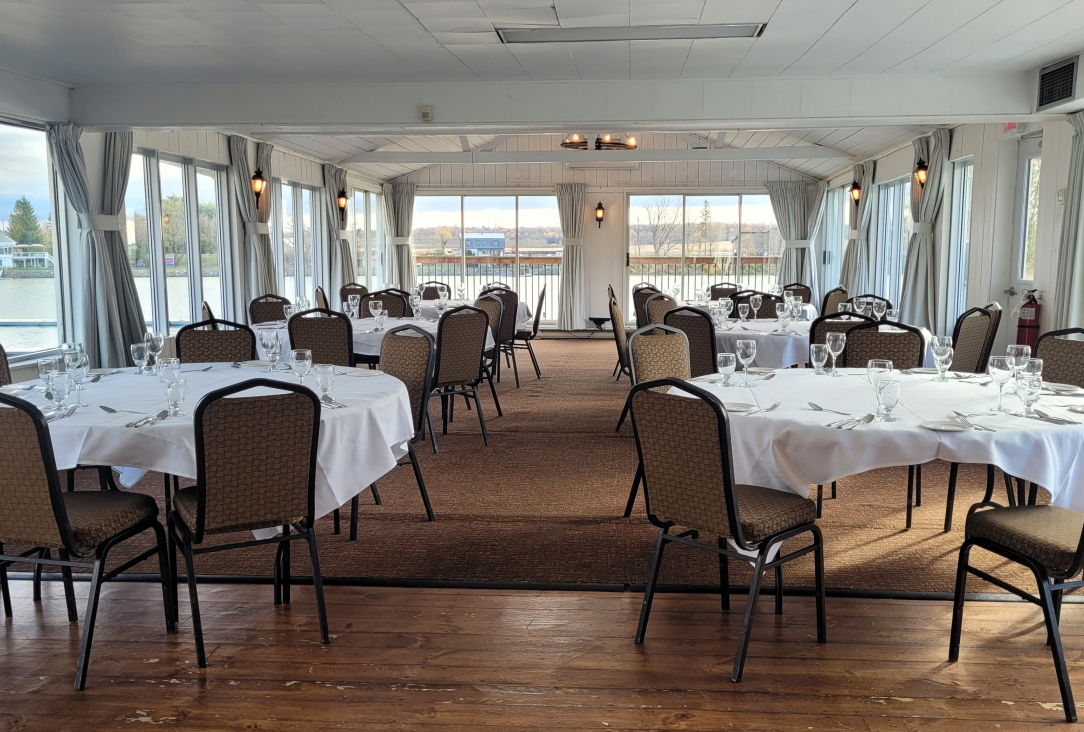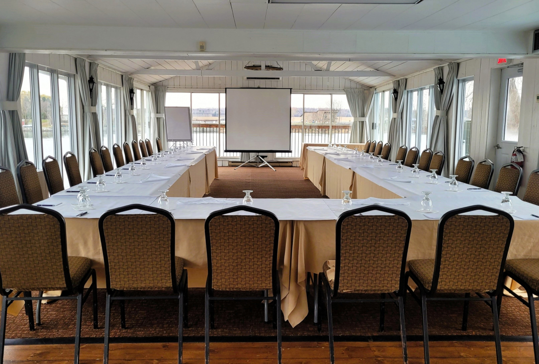 Large exterior pavillion hall, fenestration on 3 sides with with view of the Richelieu river and adjacent exterior terrace